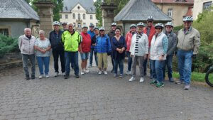 Auf dem Foto sieht man eine Kolping-Radlergruppe vor dem Gut Leyhe.
